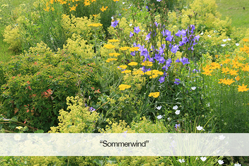 Diese pflegeleichte Stauden-Mischung wurde für trockene bis mäßig feuchte Flächen entwickelt. Sie müssen kaum gießen. Zudem ist sie sehr pflegeleicht. Die Mischung blüht in warmen Gelb und zartem Hellblau. Weiße Tupfer entstehen im Frühjahr durch das große Windröschen, im Frühsommer durch den Storchschnabel und im Spätsommer durch das Perpfötchen. Die letzte Jahreszeit wird geprägt vom Herbstkopfgras und der blauen Frühherbstaster.